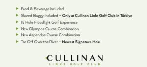 Der Cullinan Links Golf Club mit den Golfplätzen Olympos und Aspendos ist nur wenige Gehminuten vom Hotel entfernt und bietet vor der Kulisse des Taurusgebirges einen hervorragenden Blick auf das Meer auf der einen Seite und den Fluss auf der anderen Seite. Damit ist er der einzige Golfplatz in der Türkei mit einem Fluss- und Meeresufer.
