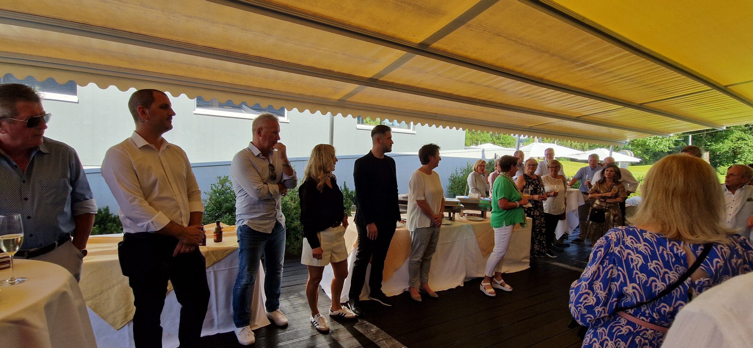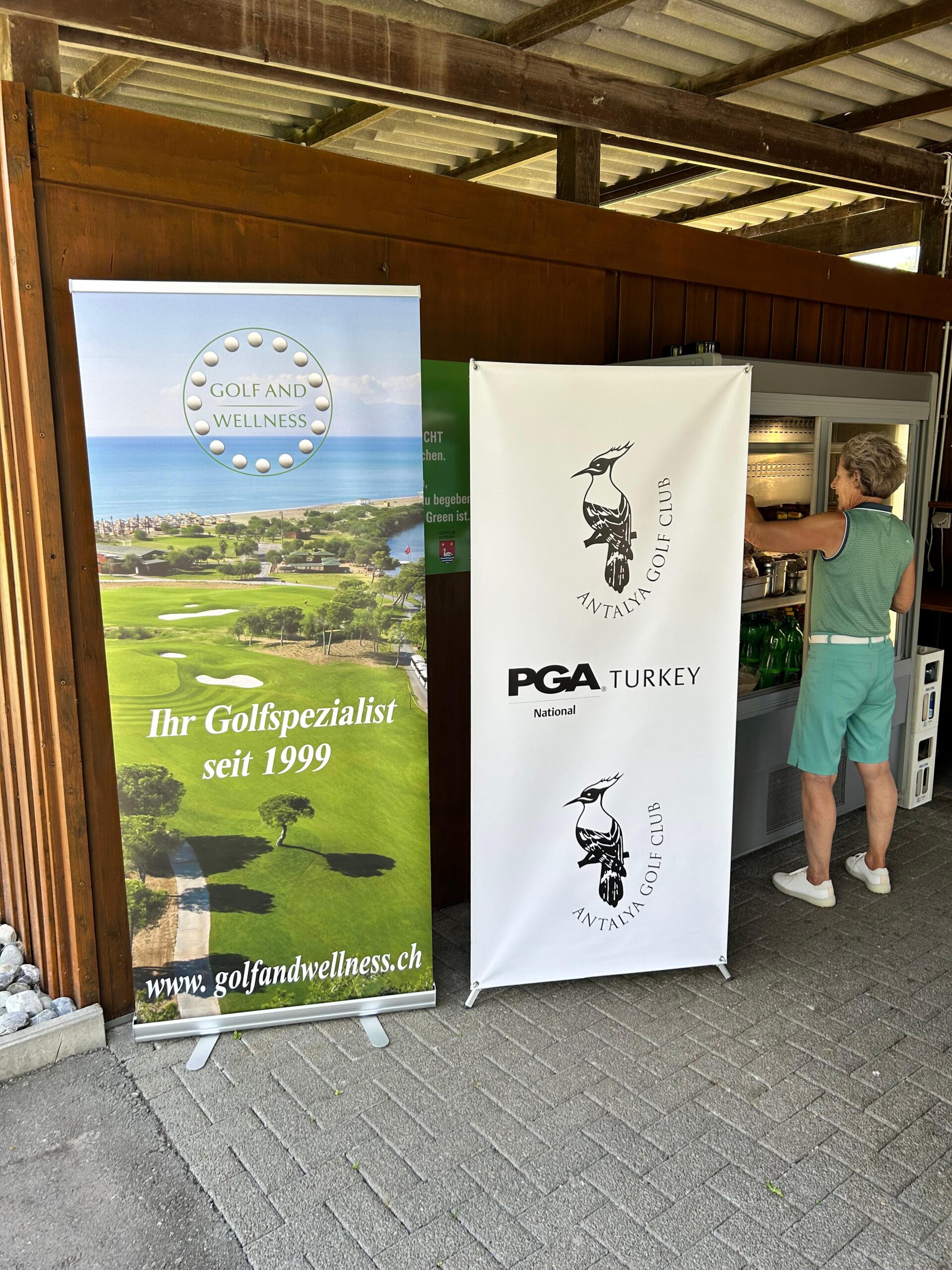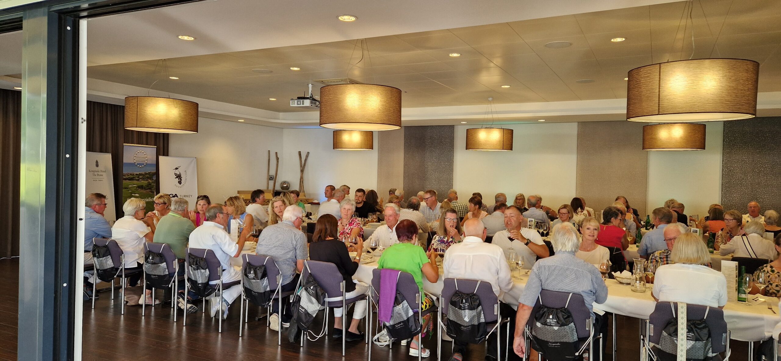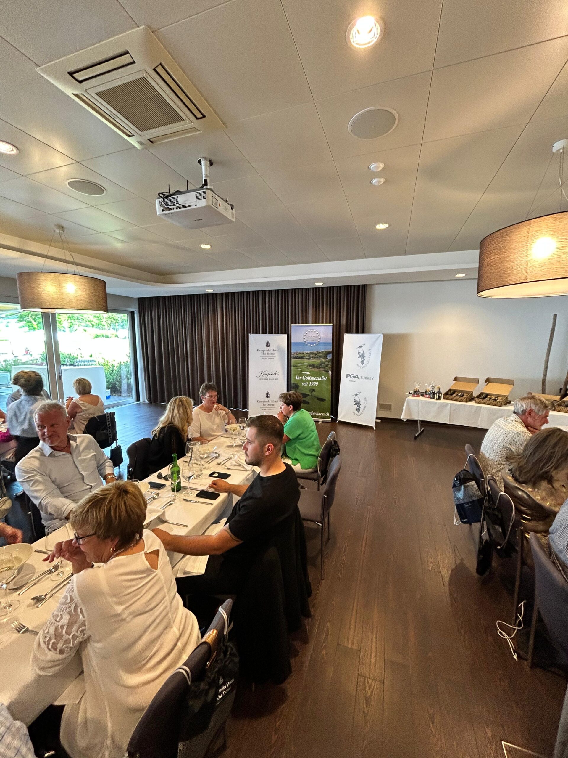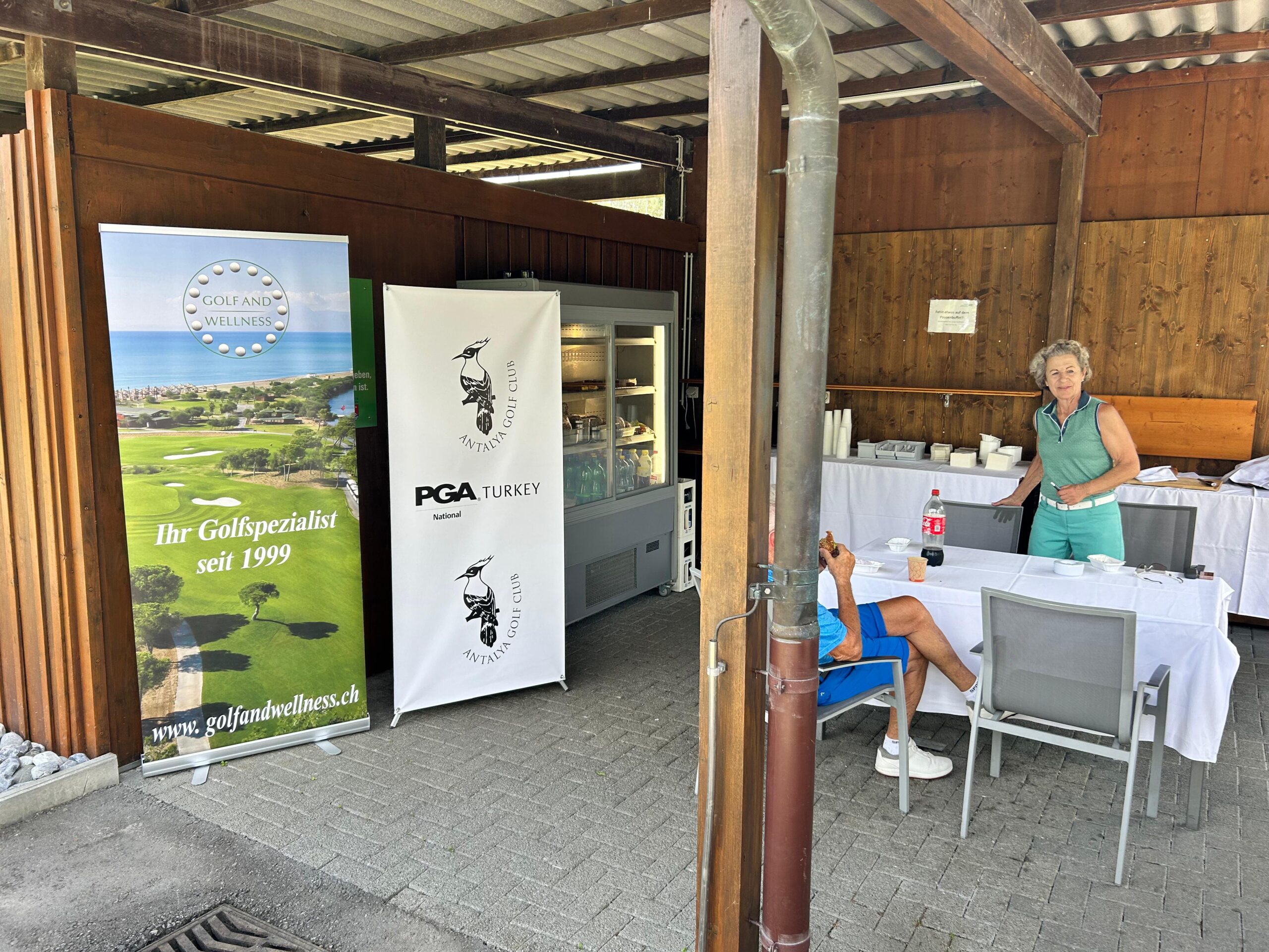 Pünktlich um 18 Uhr durften wir vor dem Pavillon das vom Reisebüro Golf and Wellness in Egg gesponserte reichhaltige Apéro geniessen. Im Nullkommanichts hatte jede und jeder ein Glas in der Hand und der Lärmpegel stieg von Minute zu Minute oder von Glas zu Glas! Captain Erika verlangte das Wort und stellte unsere heutigen Sponsoren vor. Sofort kam sie ins Schwärmen. Denn Erika als ¨Hans-Dampf in allen Gassen¨ resp. mit Golfbeziehungen weit über die Landesgrenzen hinaus, haben wir das heutige grosszügige Sponsoring zu verdanken. Unmissverständlich liess sie uns wissen, dass ¨ihr Freund¨ Kayhan Senkal sie schon seit vielen Jahren in der Ferienplanung betreut und auch sonst als Destinations- und Marketing Manager von Golf and Wellness für das Wohl der Gäste besorgt ist. Das Reisebüro-Team nahm sich ebenfalls Zeit, persönlich in Entfelden zu erscheinen. Dies sind: