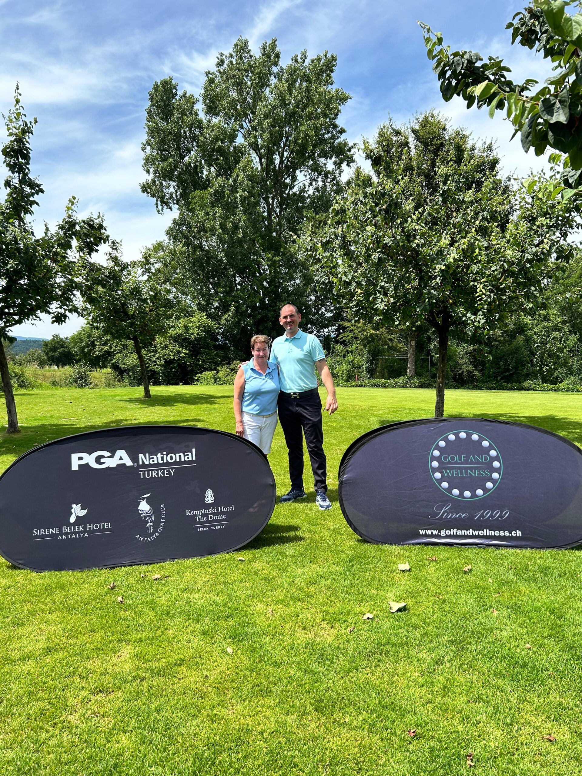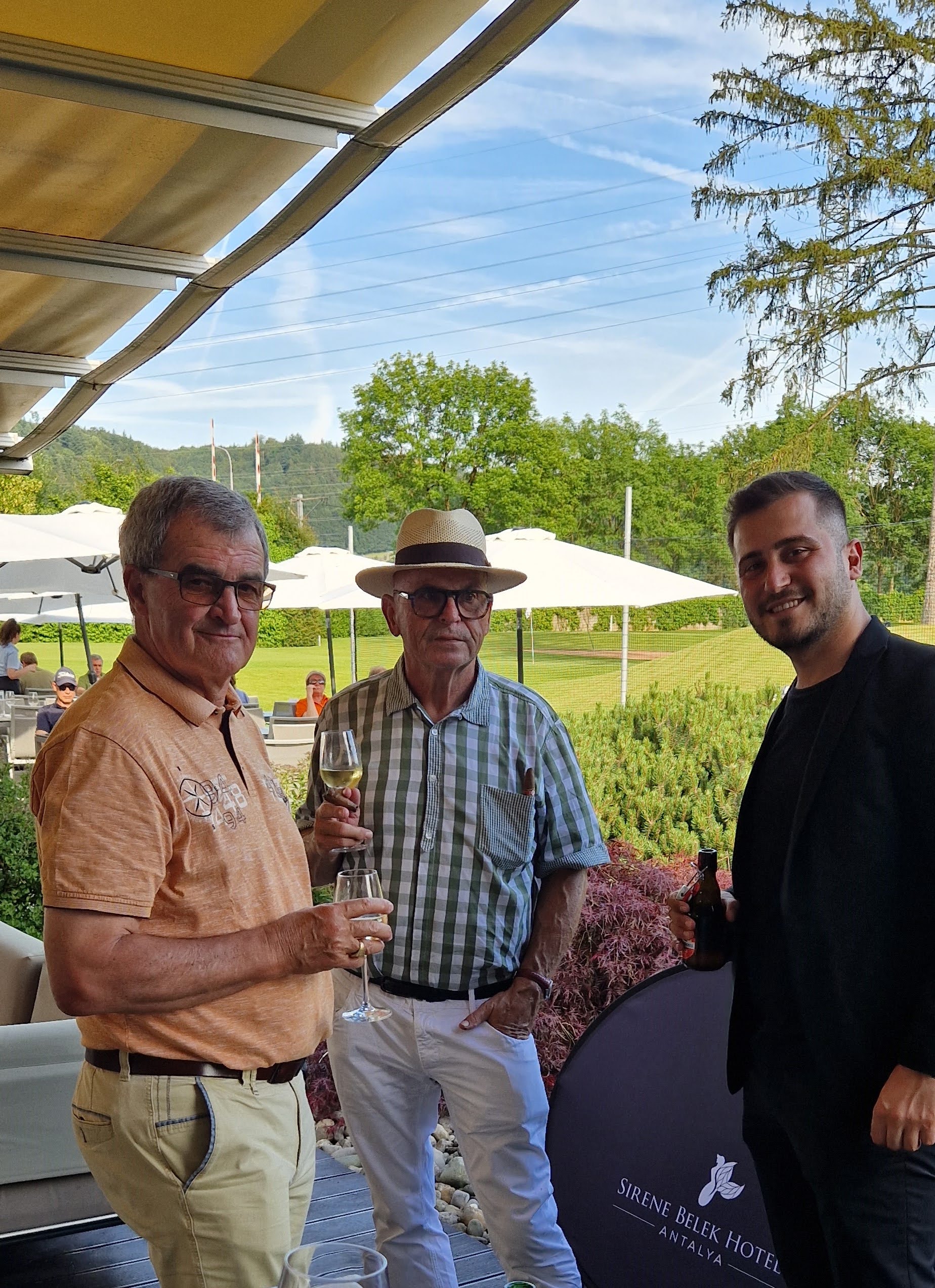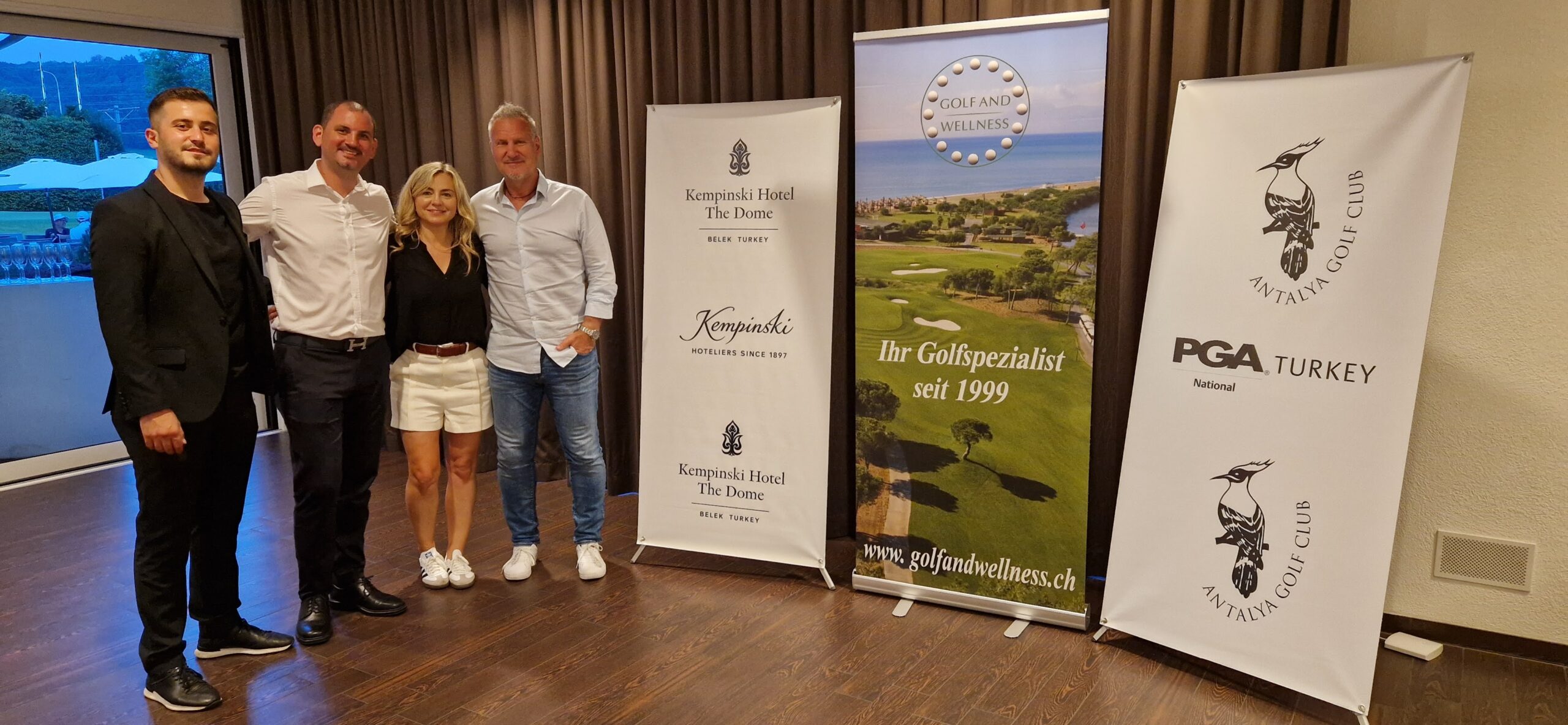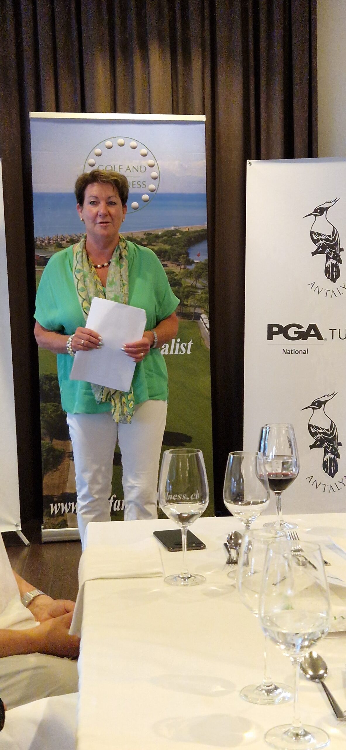 Pünktlich um 18 Uhr durften wir vor dem Pavillon das vom Reisebüro Golf and Wellness in Egg gesponserte reichhaltige Apéro geniessen. Im Nullkommanichts hatte jede und jeder ein Glas in der Hand und der Lärmpegel stieg von Minute zu Minute oder von Glas zu Glas! Captain Erika verlangte das Wort und stellte unsere heutigen Sponsoren vor. Sofort kam sie ins Schwärmen. Denn Erika als ¨Hans-Dampf in allen Gassen¨ resp. mit Golfbeziehungen weit über die Landesgrenzen hinaus, haben wir das heutige grosszügige Sponsoring zu verdanken. Unmissverständlich liess sie uns wissen, dass ¨ihr Freund¨ Kayhan Senkal sie schon seit vielen Jahren in der Ferienplanung betreut und auch sonst als Destinations- und Marketing Manager von Golf and Wellness für das Wohl der Gäste besorgt ist. Das Reisebüro-Team nahm sich ebenfalls Zeit, persönlich in Entfelden zu erscheinen. Dies sind:
