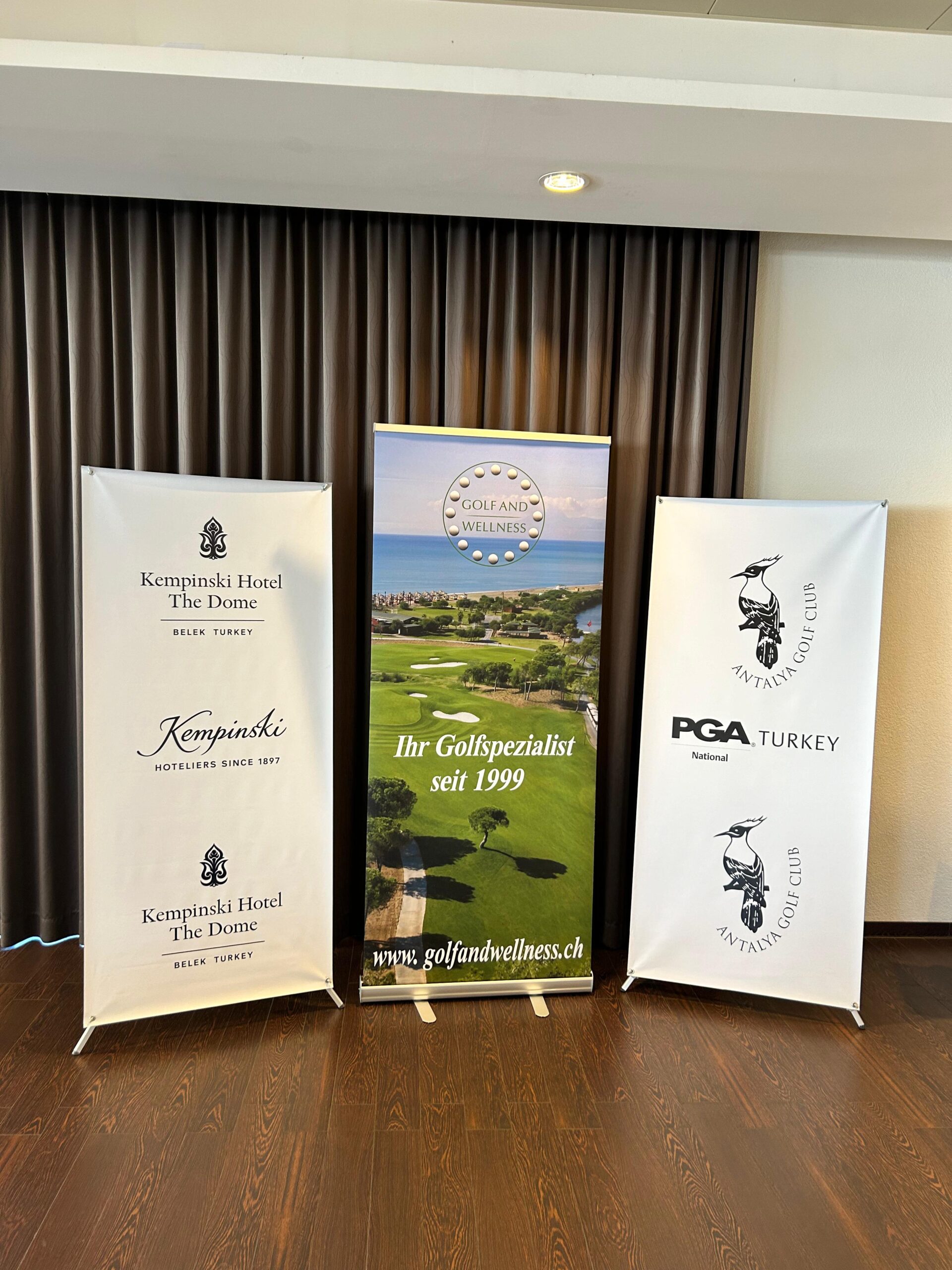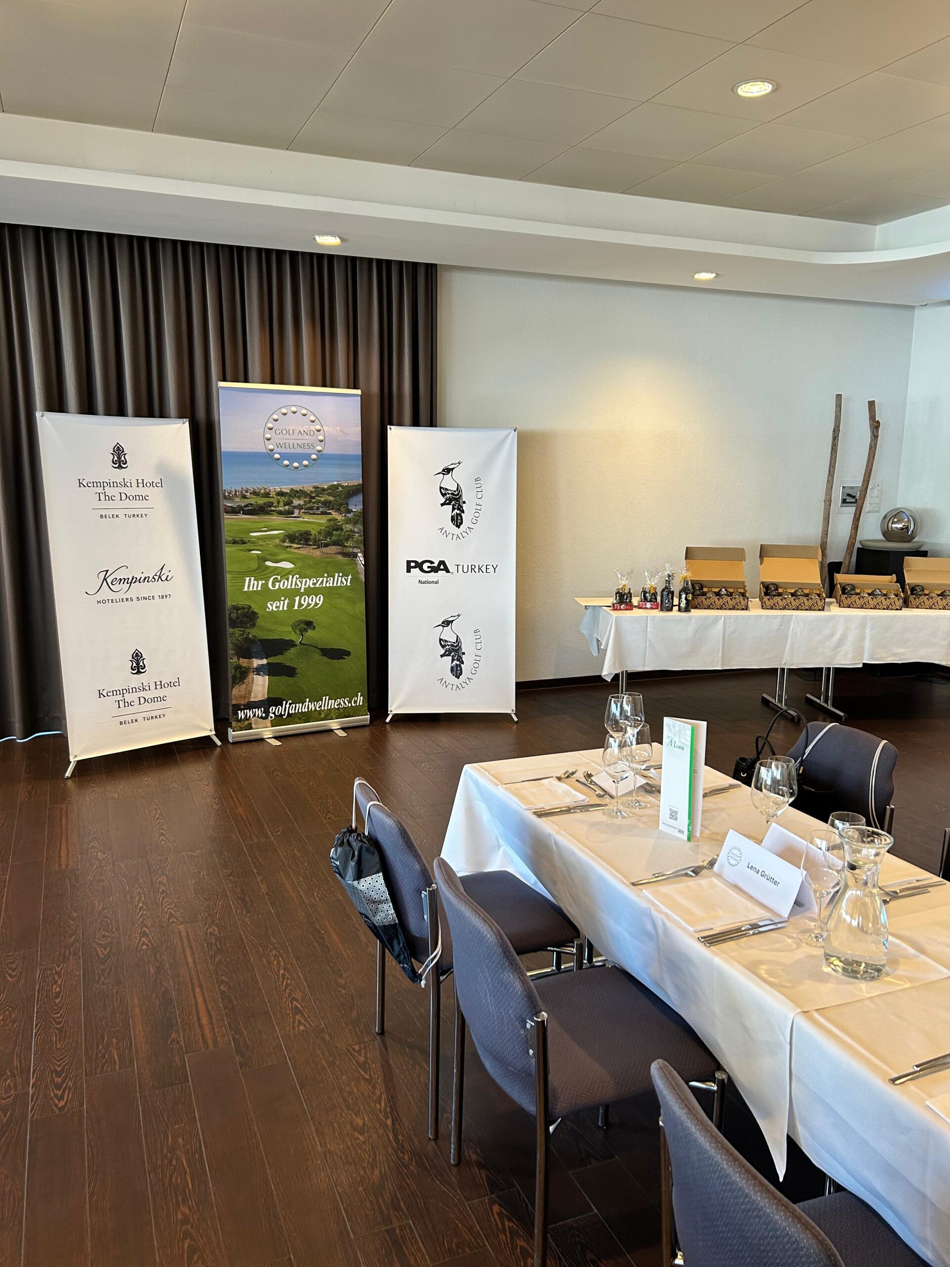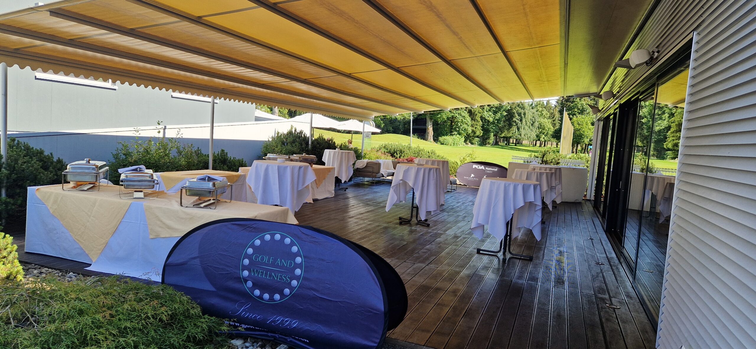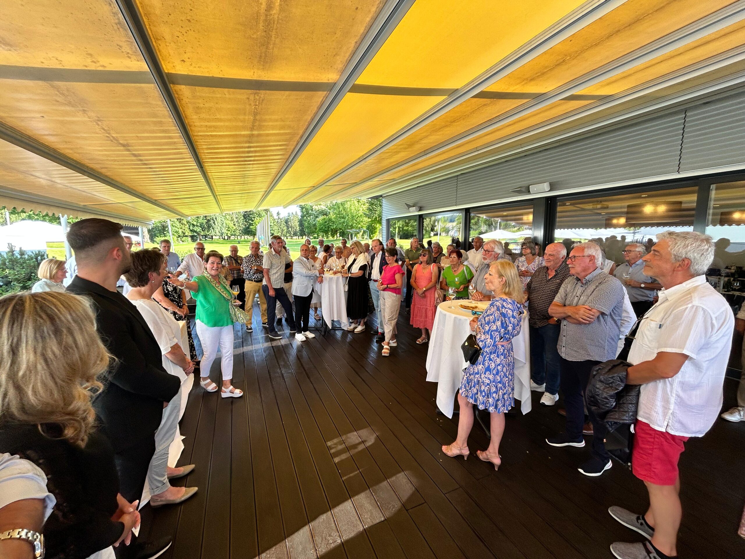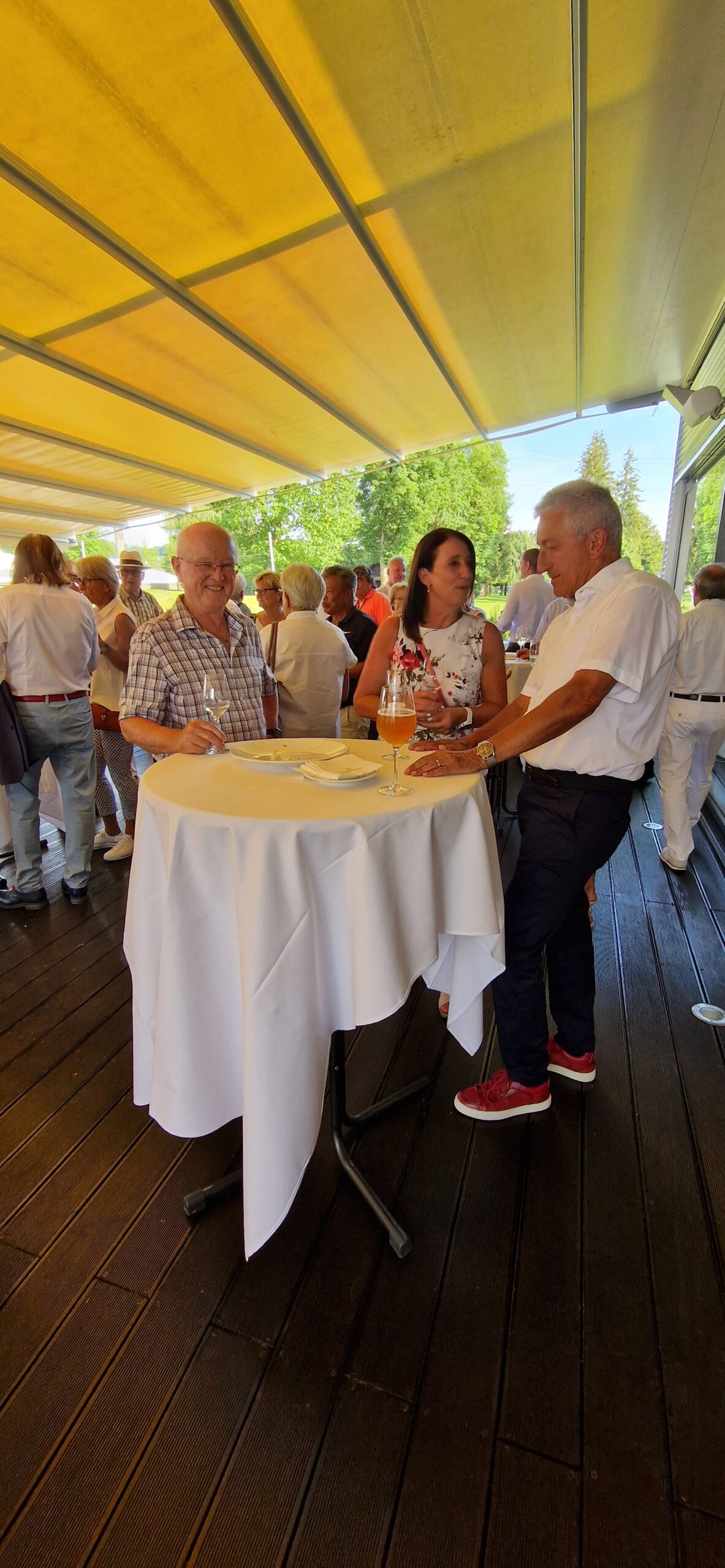 Pünktlich um 18 Uhr durften wir vor dem Pavillon das vom Reisebüro Golf and Wellness in Egg gesponserte reichhaltige Apéro geniessen. Im Nullkommanichts hatte jede und jeder ein Glas in der Hand und der Lärmpegel stieg von Minute zu Minute oder von Glas zu Glas! Captain Erika verlangte das Wort und stellte unsere heutigen Sponsoren vor. Sofort kam sie ins Schwärmen. Denn Erika als ¨Hans-Dampf in allen Gassen¨ resp. mit Golfbeziehungen weit über die Landesgrenzen hinaus, haben wir das heutige grosszügige Sponsoring zu verdanken. Unmissverständlich liess sie uns wissen, dass ¨ihr Freund¨ Kayhan Senkal sie schon seit vielen Jahren in der Ferienplanung betreut und auch sonst als Destinations- und Marketing Manager von Golf and Wellness für das Wohl der Gäste besorgt ist. Das Reisebüro-Team nahm sich ebenfalls Zeit, persönlich in Entfelden zu erscheinen. Dies sind: