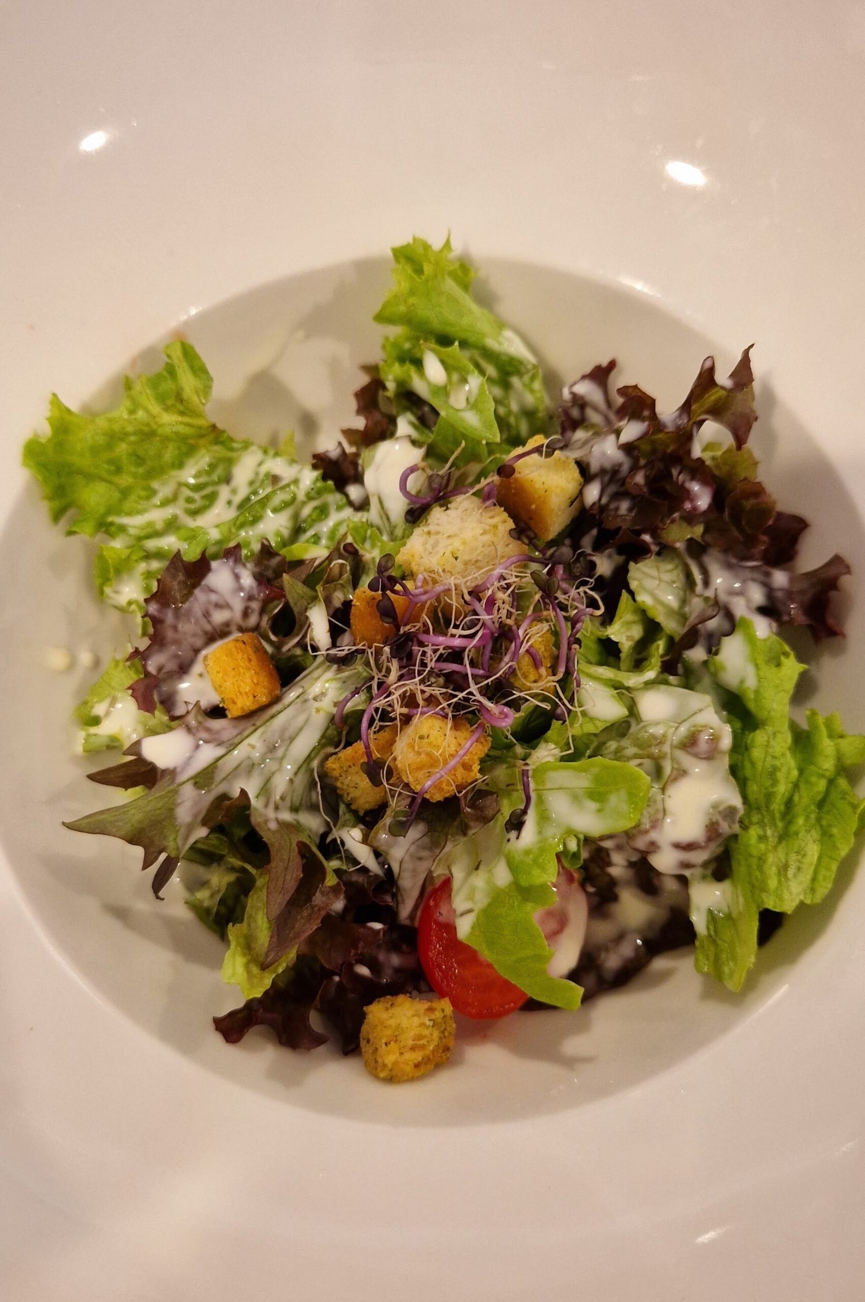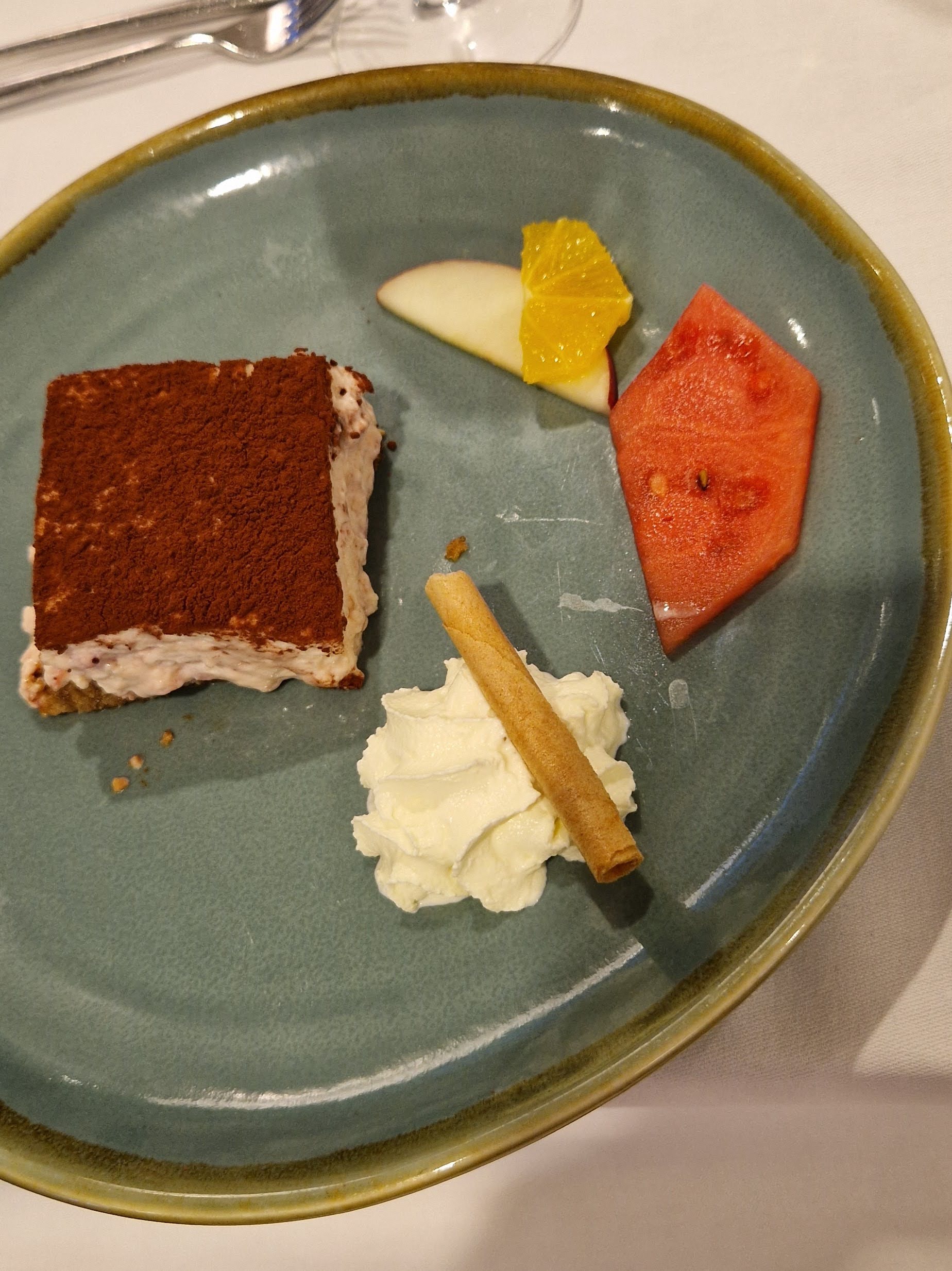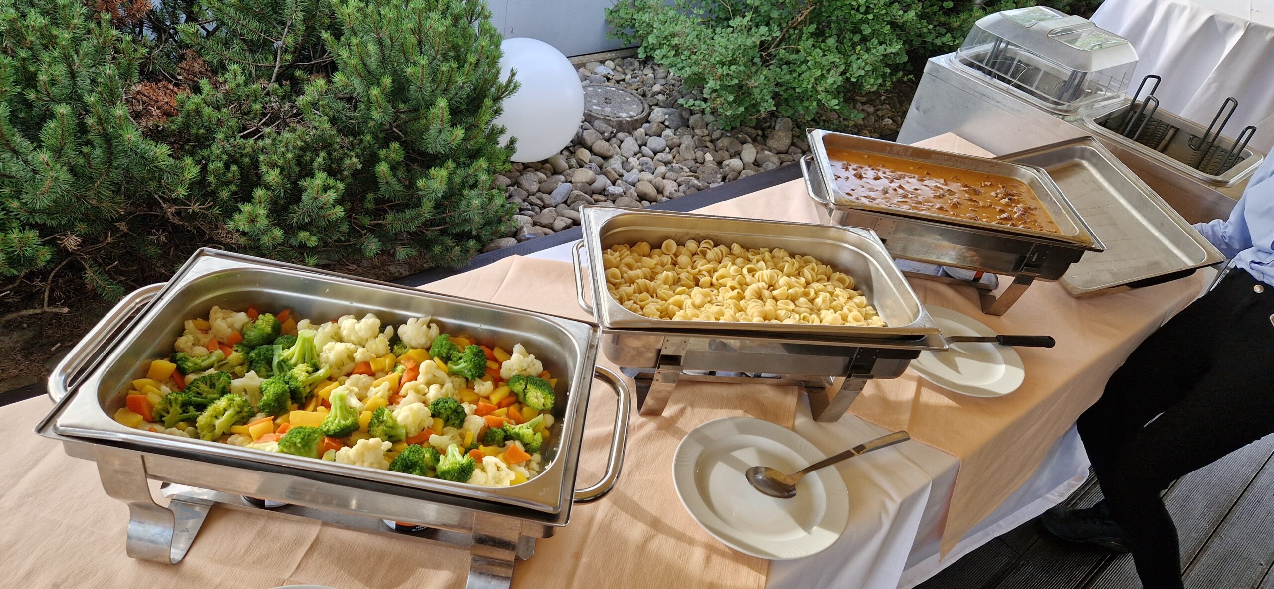 Langsam machte sich der Hunger bemerkbar und die Zeit für das ¨Sommermenu¨ war jetzt. Kaum Platz genommen entdecken wir, dass an jeder Stuhllehne eine komfortable Schuhtasche mit Aufschrift Hotel Kempinski The Dome hängt. Eine geglückte Aufmerksamkeit des Sponsors, vielen Dank. Nun galt unsere Aufmerksamkeit dem Abendessen: bunter Blattsalat, Kalbsvoressen an Rahmsauce mit Teigwaren und Gemüse, Erdbeertiramisu. Es war lecker und fein gekocht. Die Gemüsefreaks kamen auf ihre Rechnung. Dankeschön.