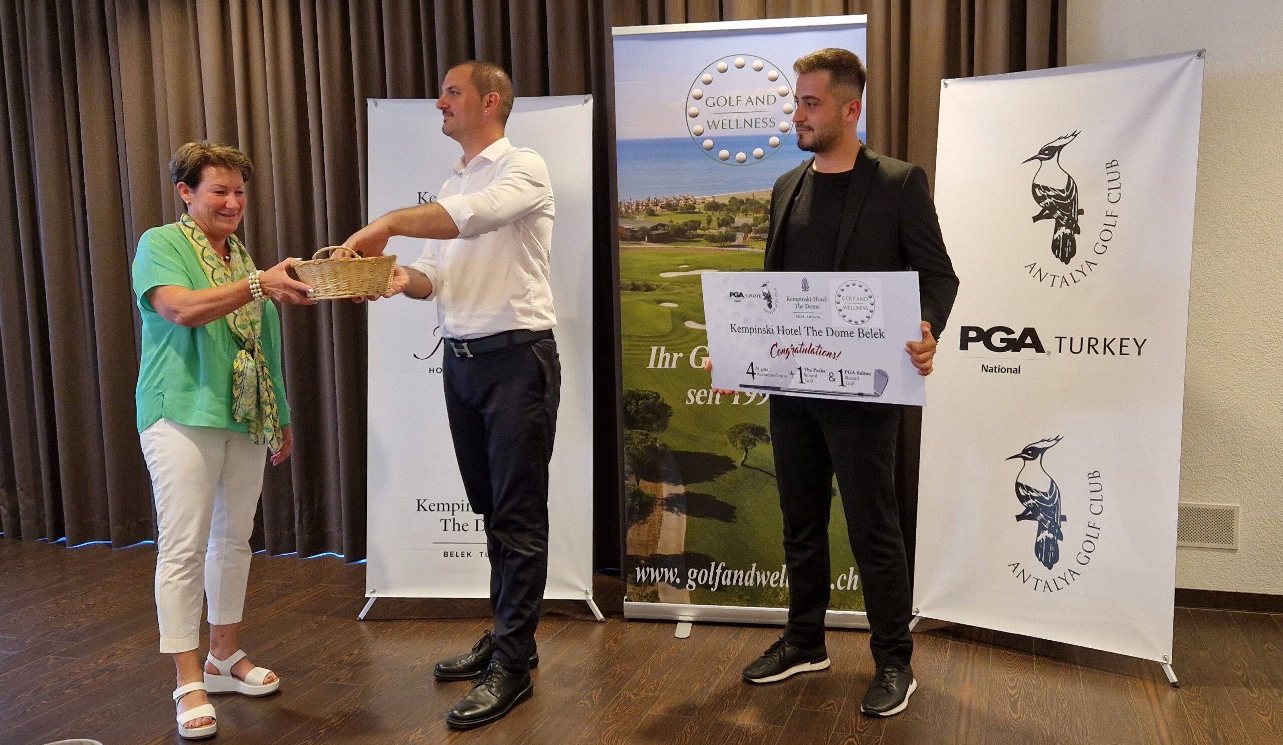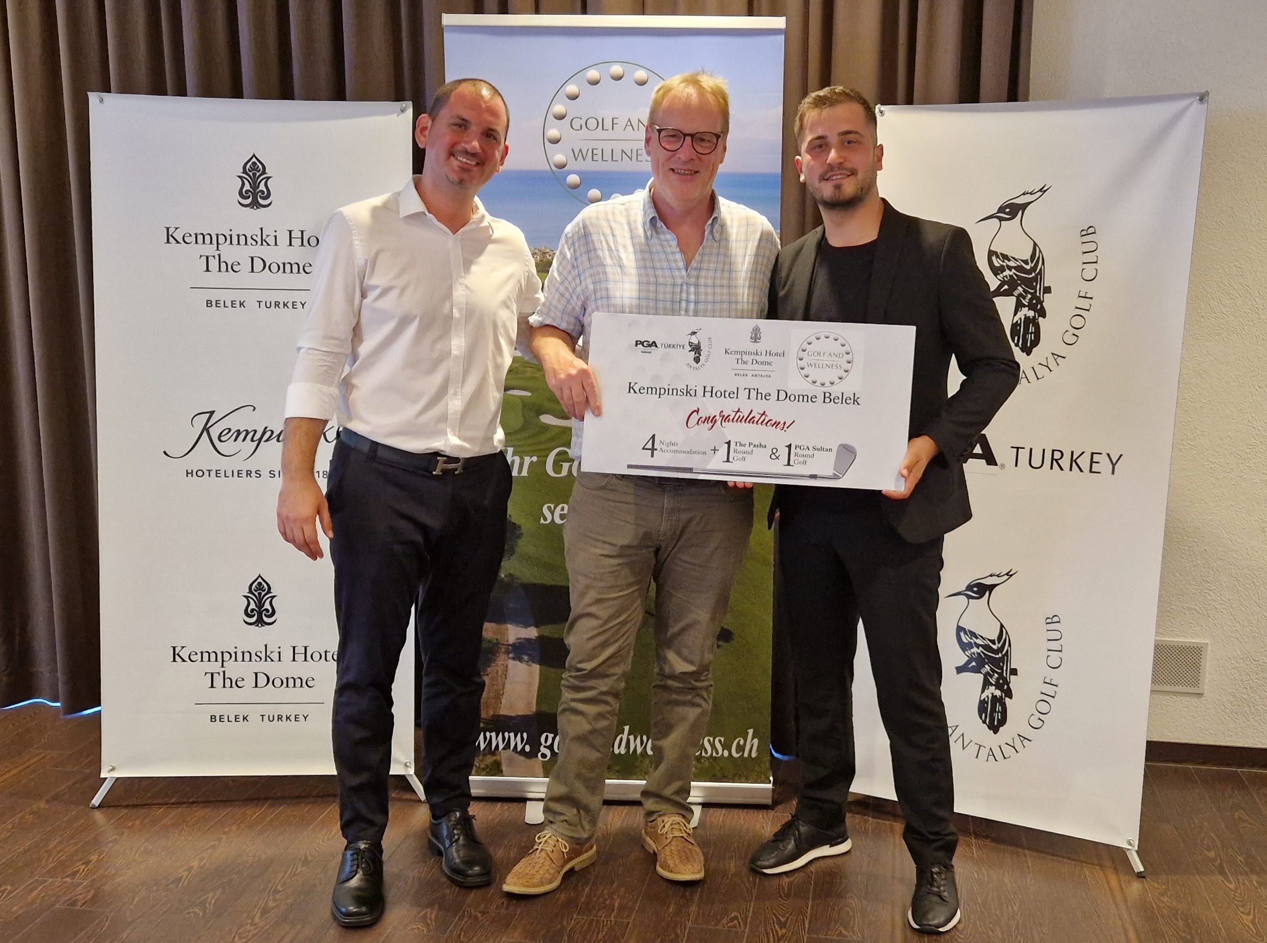 Remo Lindegger wird als Gewinner und Empfänger des Preises aus dem Loskorb gezogen. Ohne Spitzenresultat zum Hauptpreis passiert auch nicht bei jedem Golfturnier. Wir alle – und bestimmt auch deine Frau – freuen uns für dich/euch. Reisebüro Golf and Wellness die beste Buchungsadresse.